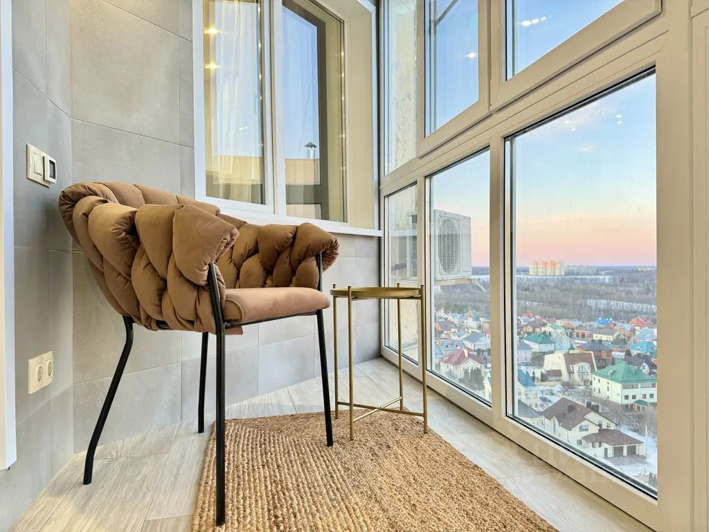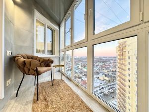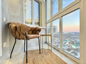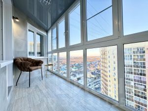 Большая лаунж-зона на лоджии с панорамным остеклением и теплым полом и шикарным видом.