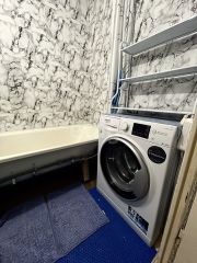 Санузел раздельный: унитаз, ванная, стиральная машина, зеркало.