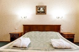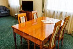 Просторный, светлый двухкомнатный номер, общая площадь 53,7 кв. м. В прихожей большой удобный гардероб для верхней одежды. Гостиная обустроена мягкой мебелью, телевизором, журнальным столиком, обеденным столом, электрочайником, набором посуды. Дверь закрывается электронным замком. В спальне расположена двуспальная кровать, шкаф, туалетный столик, телевизор. Ванная комната оборудована душевой кабиной, биде, феном, косметическим зеркалом, туалетными принадлежностями.