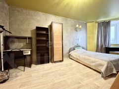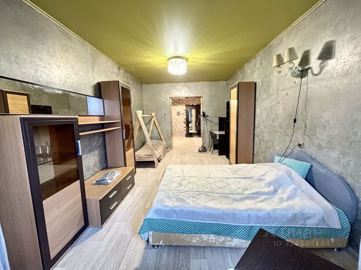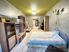В квартире имеется просторная жилая комната, в которой установлены необходимая мебель и техника для комфортного проживания: отпариватель, двуспальная кровать, односпальная кровать, шкаф, напольная полка, рабочий стол, стенка.