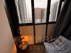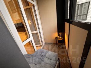 Лоджия застеклена: оборудована релакс зона с креслом и журнальным столиком.