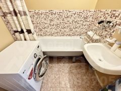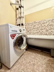 Санузел раздельный: унитаз, ванная, стиральная машина, зеркало, умывальник.