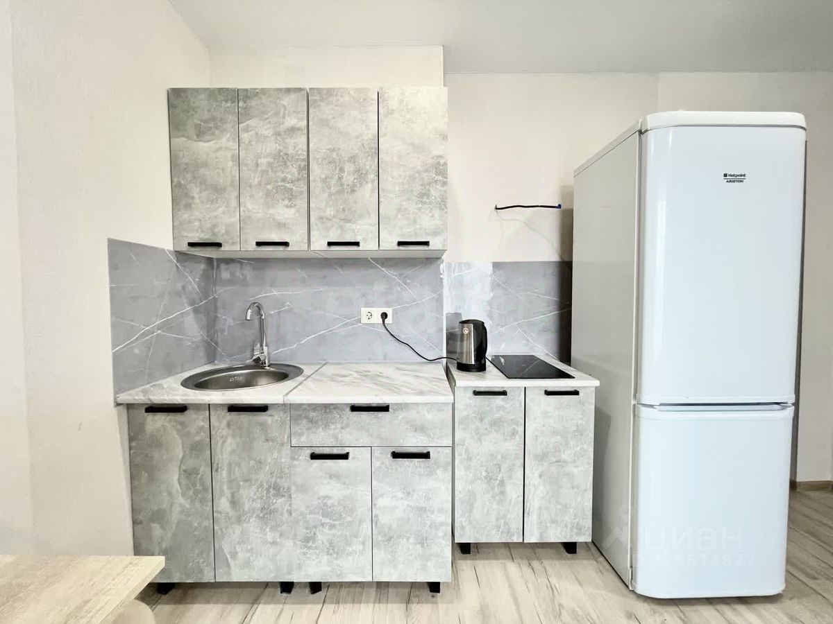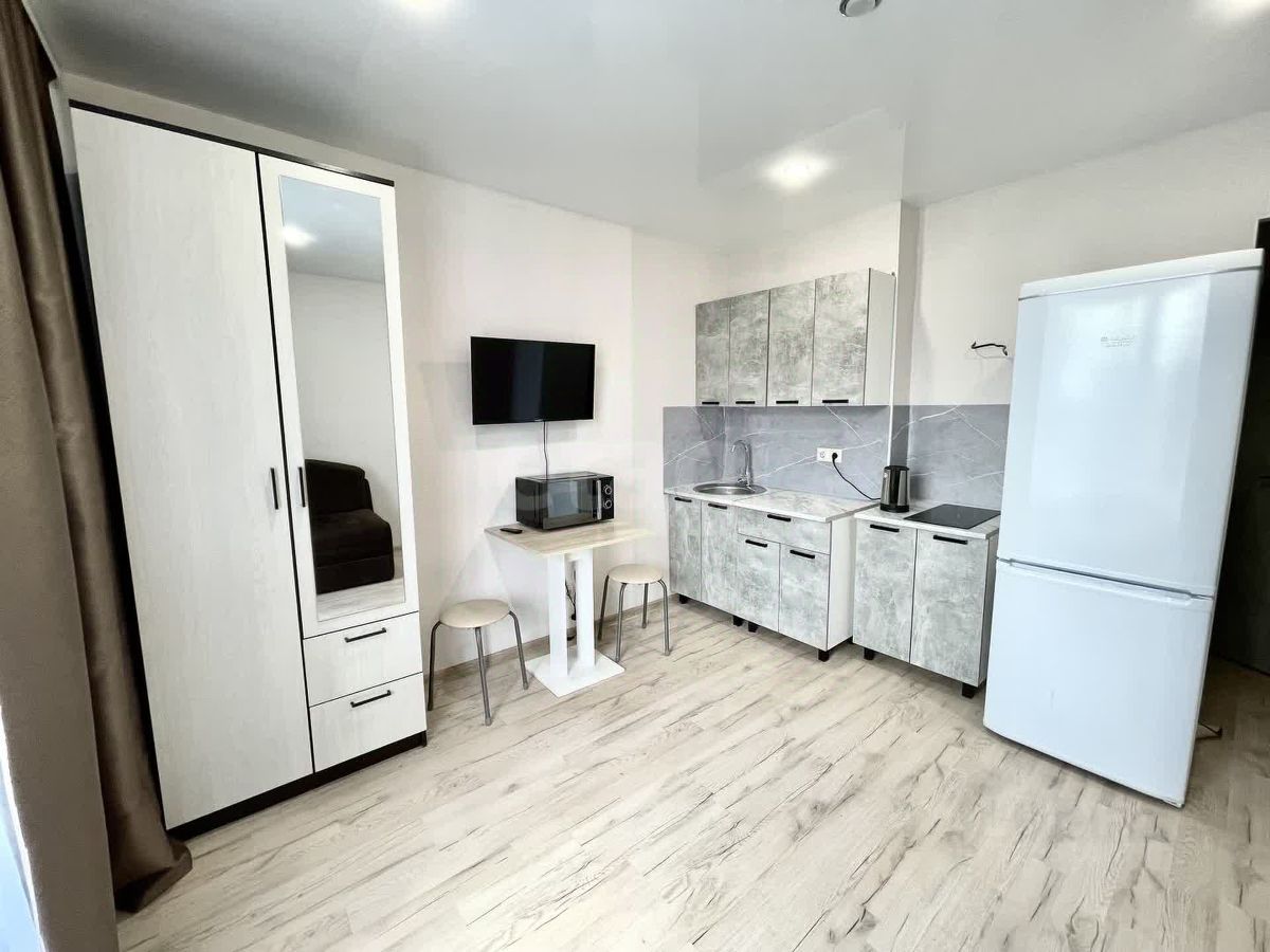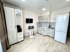В квартире имеется просторная жилая комната с совмещенной кухней, в которой установлены необходимая мебель и техника для комфортного проживания: диван, холодильник, вытяжка, электрический чайник, микроволновка, телевизор, электрическая плита с духовым шкафом, кухонный гарнитур, стол, стулья, шкаф.