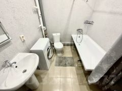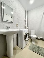 Санузел совмещен: унитаз, ванная, стиральная машина, зеркало, умывальник со шкафчиками.
