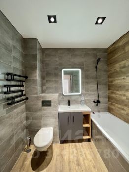 Просторный санузел, облицованный керамогранитом, установлена качественная современная сантехника