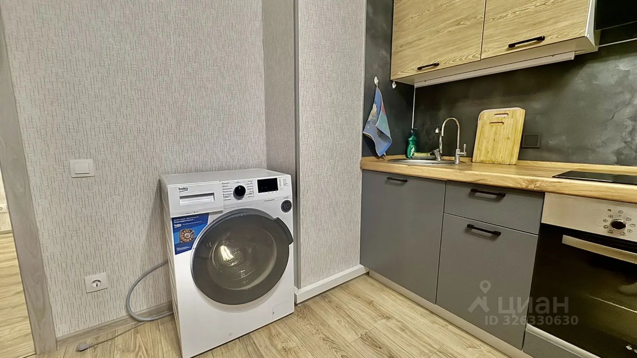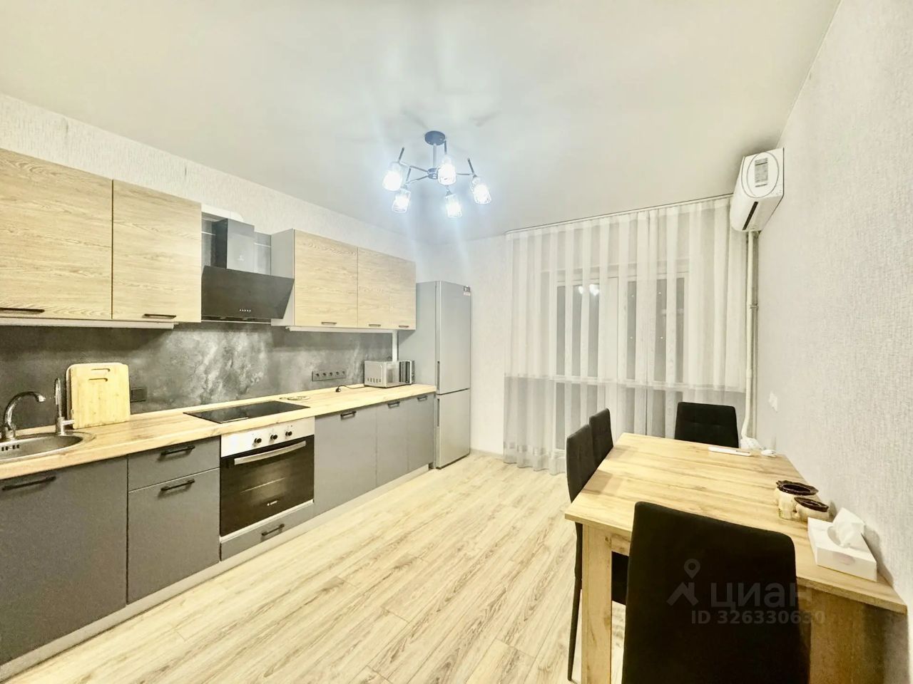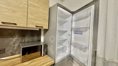 Кухня просторная, площадью 15 м², оснащена всей необходимой бытовой техникой, включая холодильник и стиральную машину. В гостиной и на кухне установлены кондиционеры, а также имеется телевизор. Из мебели — шкафы и удобный диван.
