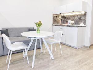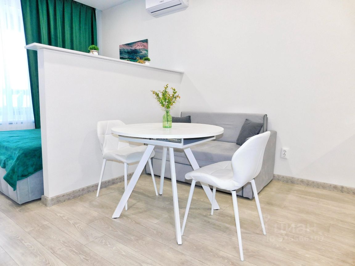 Сдается светлая уютная студия площадью 29 кв.м. с современным ремонтом. Уютная зона отдыха с большой двухспальной кроватью и диваном, который при необходимости можно использовать, как полноценную кровать. Полностью оборудованная кухня с обеденной группой. А еще есть прекрасный видовая лоджия с барной стойкой и стульями, где можно насладиться чашечкой ароматного кофе.