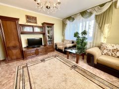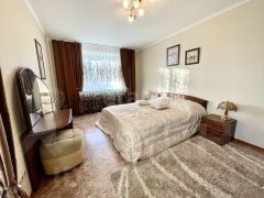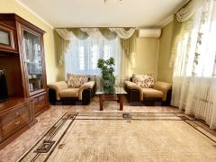 В квартире имеется просторные жилые комнаты, в которых установлены необходимая мебель и техника для комфортного проживания: кондиционер, телевизор, двуспальная кровать с матрасом, шкаф с зеркалом, туалетный столик с пуфиком, диван, два кресла, журнальный столик, стенка под ТВ.