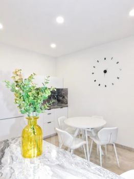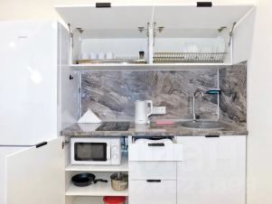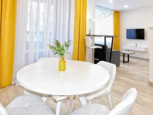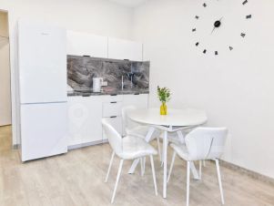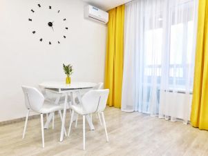 Светлая уютная студия площадью 40 кв. м. с современным ремонтом. Уютная зона отдыха с большой двухспальной кроватью. Есть диван, который при необходимости превращается в полноценную кровать. Полностью оборудованная кухня с обеденной группой.