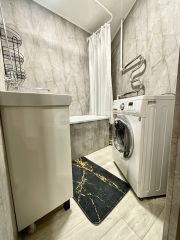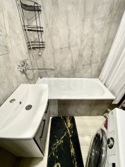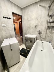 Санузел раздельный: унитаз, ванная, стиральная машина, зеркало, умывальник.