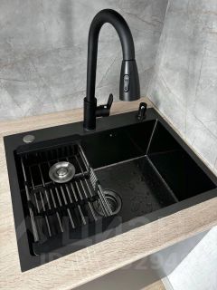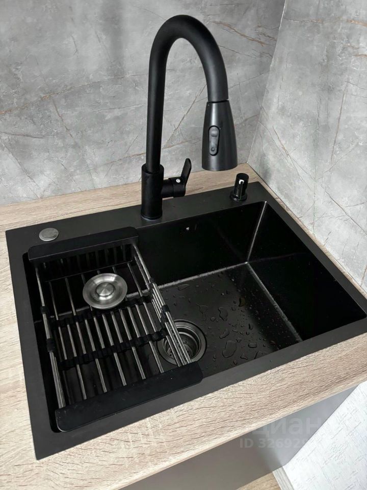 Кухня просторная, площадью 11 кв.м., оснащена всем необходимым: холодильник, варочная панель, стильная мойка, электрический чайник. Из мебели — вместительные шкафы, раскладной стол и мягкие табуреты.