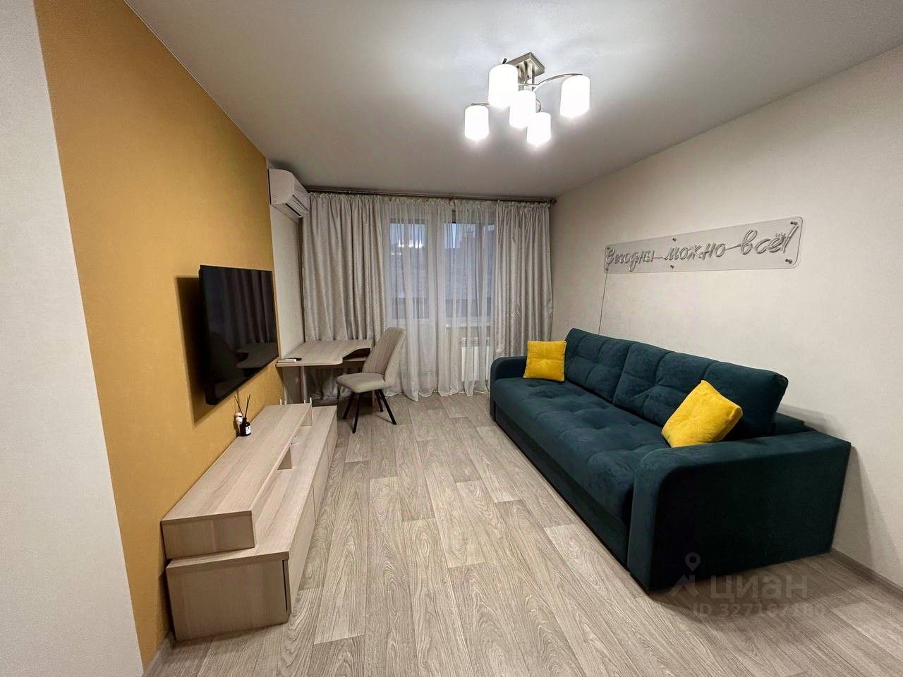Гостиная: раскладной диван, шкаф с вешалками, тумба с выдвижными ящиками, стол для работы, стул.