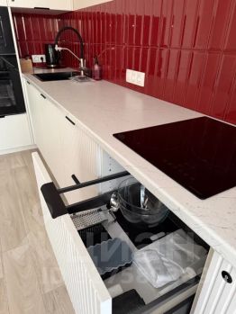 Кухня с обеденным столом, стульями, современным кухонным гарнитуром, варочный панелью, духовым шкафом, холодильником, микроволновой печью, электрочайником, посудой и всем необходимым для приготовления вкусных блюд. Для вашего удобства есть фильтр питьевой воды.