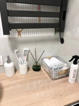 Современный санузел с ванной, стиральной машиной, туалетными принадлежностями (т. Бумага, мыло, гель для душа, шампунь) и феном, чтобы вы всегда выглядели на высоте.