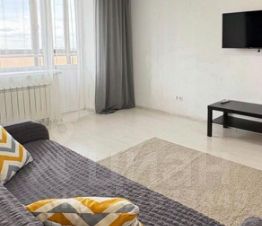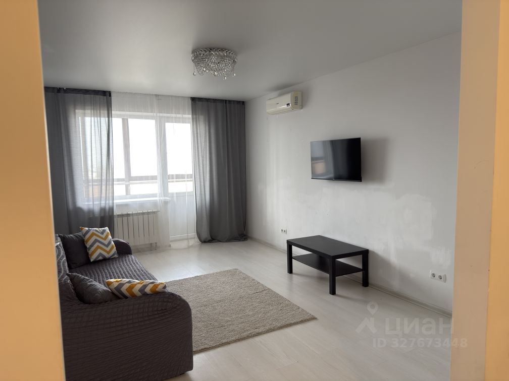 Кухня площадью 15 м² оборудована современной техникой, включая холодильник и плиту. В гостиной установлен кондиционер и телевизор. Из мебели имеются шкафы и диван.