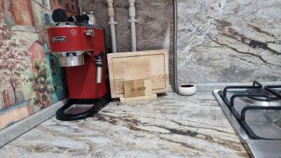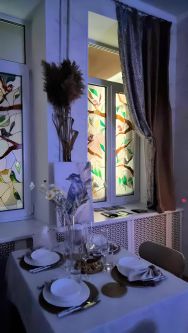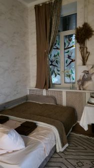 В этой квартире удобно разместятся 4 человека , так как имеется отдельная светлая спальня , проходная комната с роскошным диваном транформируемым в полноценное спальное место с фресками на окнах в которой стоит большой стол для званого обеда или ужина , а в небольшой и уютной кухне можно завтракать пока некоторые ещё спят .