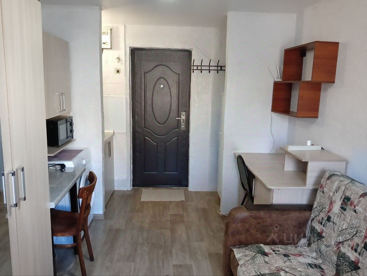 В комнате натяжной потолок, пластиковое окно, новая батарея, металлическая дверь. Имеется в комнате мокрая точка раковина с водой.