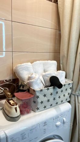В наличии: свежие полотенца, одноразовые тапочки, средства личной гигиены, порошок.