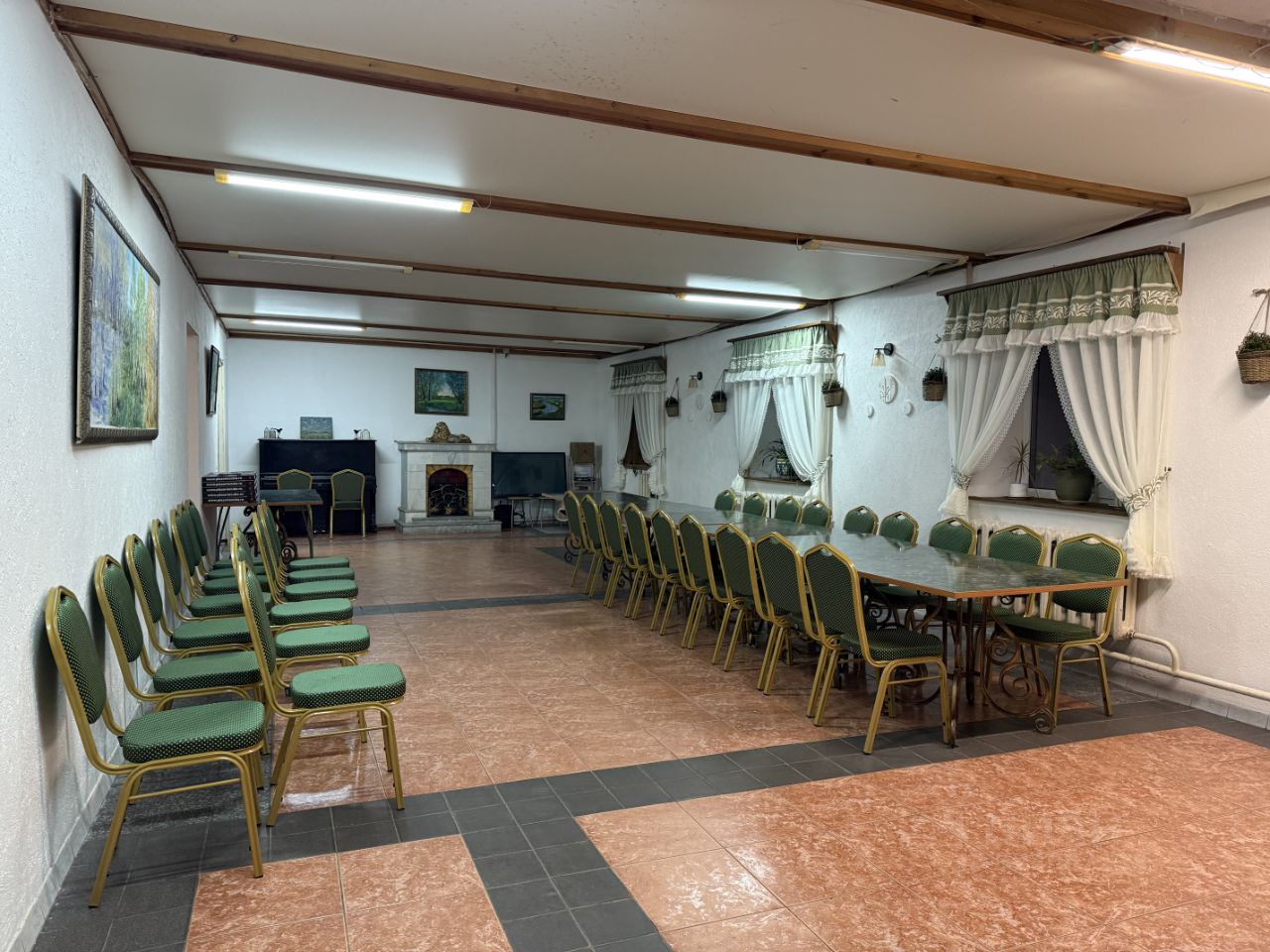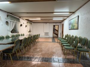 Уважаемые, гости, в доме имеется 5 двухспальных кроватей, 10 односпальных. Банкетный зал рассчитан на 35 человек. Посуда предоставляется по договоренности.