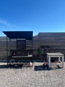 мангальная зона с угольным мангалом, шампурами и решёткой — всё готово для стейка с дымком!