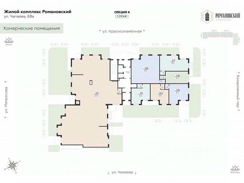 Предлагается к продаже помещение свободного назначения в Жилом Комплексе "Романовский" в самом сердце Ленинского района. Данный вариант отлично подходит для любого вида коммерческой деятельности, такого как: фитнес-студия, спортивная секция, салон красоты, пункт выдачи, магазин формата "у дома", продовольственный магазин, кофейня, и тд. В помещении есть отдельный вход и санузел. Выполнена черновая отделка, заведено электричество, подведена вода и канализация. Возможность размещения информационных вывесок на фасаде здания для привлечения внимания со стороны пешеходов. Преимущества месторасположения: • Романовский рассчитан на 700 жителей, имеется подземный и наземный паркинг на закрытой территории; • В 15 минутах ходьбы от дома расположены: стадион "Чайка", креативный кластер "Станция" и Военно-воздушная академия имени профессора Н. Е. Жуковского и Ю. А. Гагарина; • Удобные заезды на ключевые магистрали: улицы Чапаева и Краснознаменная, Казарменный переулок обеспечивают превосходную транспортную доступность; • В радиусе 750 метров расположены три остановки общественного транспорта. Более 11 маршрутов общественного транспорта позволят без суеты добраться в любую точку города; • В районе уже сформирована инфраструктура: продуктовые магазины, аптеки, кафе, поликлиники, детские центры и другие повседневные сервисы. Отличный вариант для Вашего бизнеса! Возможно, вы искали: Коммерческая недвижимость в Воронеже, Коммерческая недвижимость на правом берегу, Купить коммерческое помещение на правом берегу, Коммерческое помещение в Ленинском районе, Коммерческая недвижимость на правом берегу Воронеж, Коммерческое помещение в жилом комплексе, Коммерция Романовский, Купить коммерческую недвижимость в Воронеже, Купить коммерческую недвижимость Романовский, Нежилое помещение Романовский, Купить нежилое помещение в Романовском, Площади для инвестиций в Воронеже, Стоимость коммерции в Воронеже, Стоимость коммерции в ЖК Романовский, Коммерческая недвижимость в Воронеже на 1 этаже, Продажа нежилого помещения в Воронеже, Продажа торгового помещения в Воронеже, Офис в Воронеже, Нежилые помещения в Воронеже, Коммерция в Воронеже, Торговые площади в Воронеже, Стоимость нежилого помещения в Воронеже.