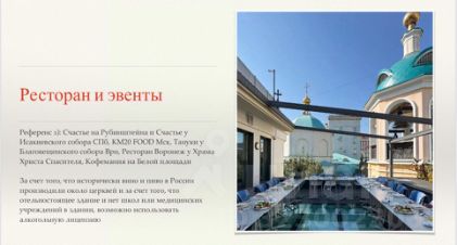 Не имеет ограничений по назначению, за исключением ограничений 73-ФЗ по тяжелым производствам. Возможно под любое назначение, например, ресторан с алкогольной лицензией по примеру ресторана Воронеж у Храма Христа Спасителя, КМ-20 около СовФед и Подворья, ресторан и отель Яр у Церкви Бориса и Глеба, Тануки Воронеж у Благовещенского собора, Кофемания на Белой площади, Счастье у Исаакия, с соблюдением требований п. 8) статьи 16 ФЗ 171-ФЗ.