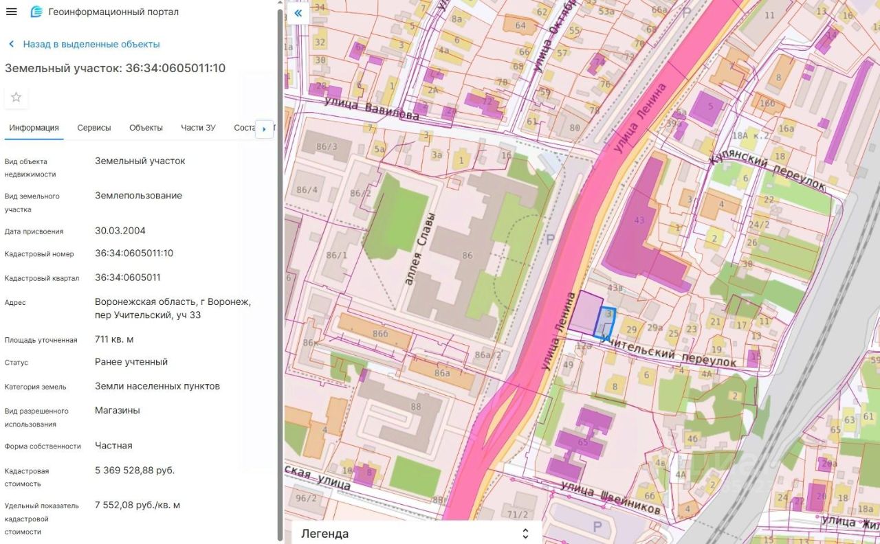 Продается земельный участок по адресу: г. Воронеж, пер. Учительский, 33 (площадь 711 кв.м, вид разрешенного использования "магазины", кадастровый номер 36:34:0605011:10). Участок свободен от строений. Готов для строительства магазина. Получено разрешение на строительство магазина общей площадью 670 кв.м, количество этажей - 3, включая 1 подземный. Участок расположен по красной линии по ул. Ленина, имеет отличную транспортную и пешеходную доступность. Отличное место для ведения бизнеса.