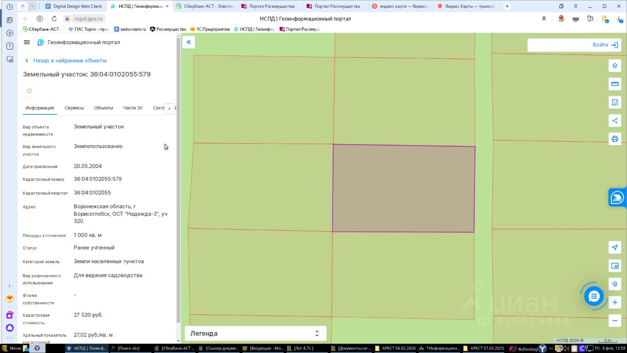 Лот 11 (повторные торги). Земельный участок площадью 1000 кв. м, кадастровый номер 36:04:0102055:579, категория земель - земли населенных пунктов, вид разрешенного использования - для ведения садоводства, местонахождение: Воронежская обл., г. Борисоглебск, ОСТ "Надежда-3", уч. 320. Собственник - Попова О.В.