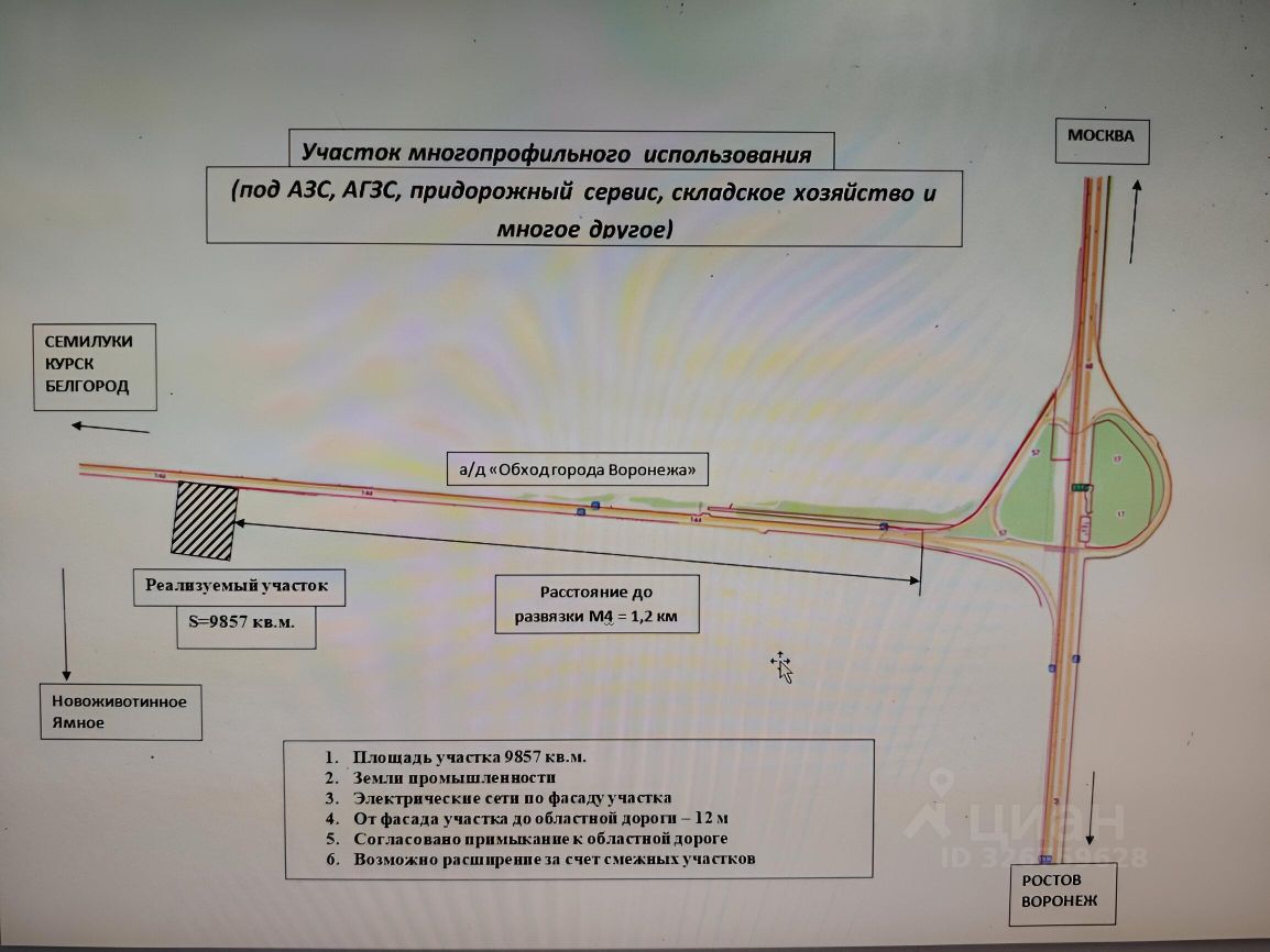 Продам земельный участок из категории земель - земли промышленности (П1) на территории Рамонского района Воронежской области, расположенный вдоль автомобильной дороги (красная линия) с высокой интенсивностью движения. Участок расположен в 800 м от транспортной развязки федеральной трассы М4 "Дон" Москва-Ростов. Отдаленность от города Воронежа по направлению в сторону Москвы 23 км. Рядом с участком проходят транспортные потоки на Курск, Воронеж, Ростов, Москву. Участок состоит из трех обособленных участков с кадастровыми номерами 36:25:6945018:8728, 36:25:6945018:8828, 36:25:6945018:1377 находящихся в собственности, общей площадью 98,57 соток. Использование участка многопрофильное (под АЗС, АГЗС, придорожный сервис, складское хозяйство и многое другое). Срочная продажа. Торг с реальным интересантом.
