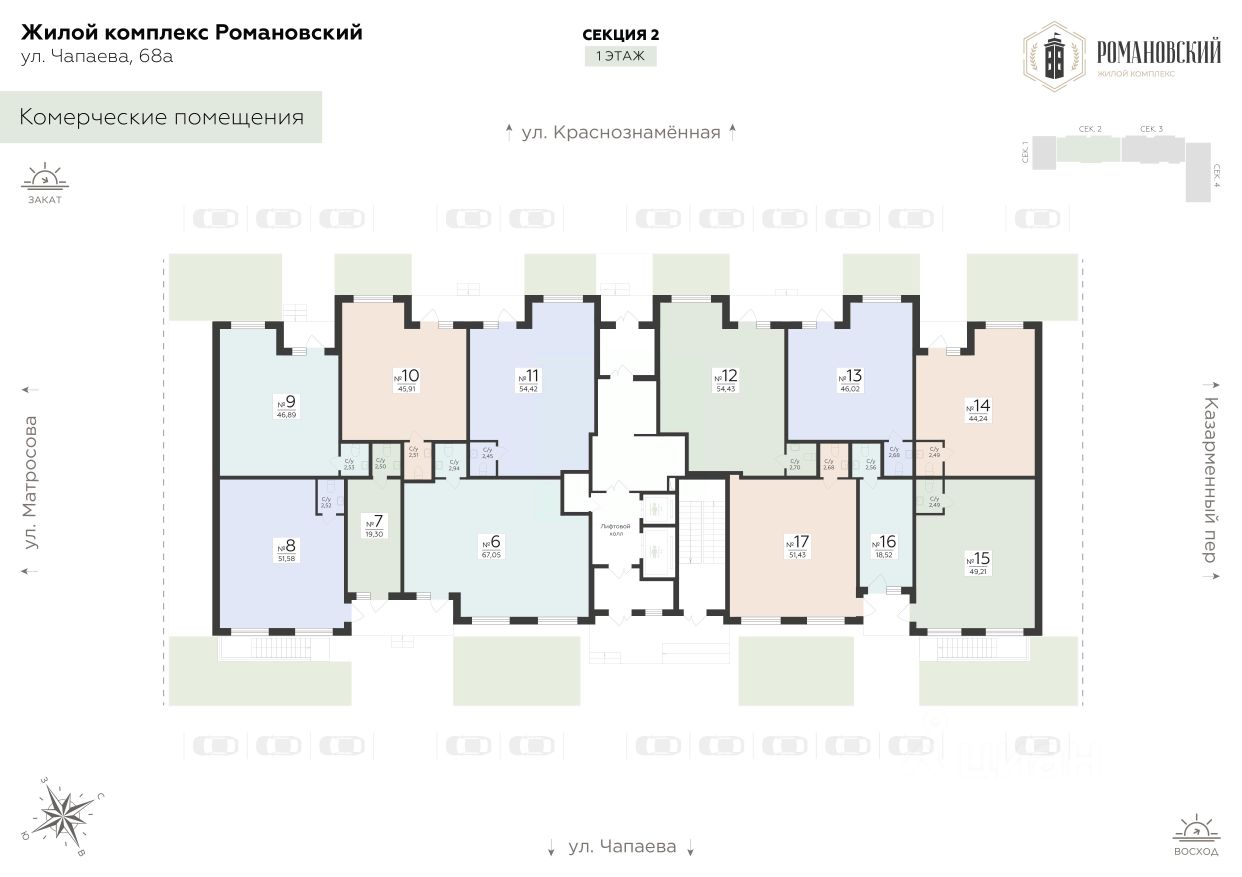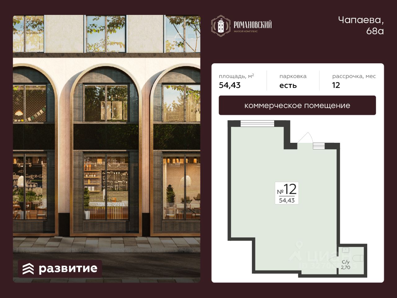 Предлагается к продаже помещение свободного назначения в Жилом Комплексе "Романовский" в самом сердце Ленинского района. Данный вариант отлично подходит для любого вида коммерческой деятельности, такого как: фитнес-студия, спортивная секция, салон красоты, пункт выдачи, магазин формата "у дома", продовольственный магазин, кофейня, и тд. В помещении есть отдельный вход и санузел. Выполнена черновая отделка, заведено электричество, подведена вода и канализация. Возможность размещения информационных вывесок на фасаде здания для привлечения внимания со стороны пешеходов. Преимущества месторасположения: • Романовский рассчитан на 700 жителей, имеется подземный и наземный паркинг на закрытой территории; • В 15 минутах ходьбы от дома расположены: стадион "Чайка", креативный кластер "Станция" и Военно-воздушная академия имени профессора Н. Е. Жуковского и Ю. А. Гагарина; • Удобные заезды на ключевые магистрали: улицы Чапаева и Краснознаменная, Казарменный переулок обеспечивают превосходную транспортную доступность; • В радиусе 750 метров расположены три остановки общественного транспорта. Более 11 маршрутов общественного транспорта позволят без суеты добраться в любую точку города; • В районе уже сформирована инфраструктура: продуктовые магазины, аптеки, кафе, поликлиники, детские центры и другие повседневные сервисы. Отличный вариант для Вашего бизнеса! Возможно, вы искали: Коммерческая недвижимость в Воронеже, Коммерческая недвижимость на правом берегу, Купить коммерческое помещение на правом берегу, Коммерческое помещение в Ленинском районе, Коммерческая недвижимость на правом берегу Воронеж, Коммерческое помещение в жилом комплексе, Коммерция Романовский, Купить коммерческую недвижимость в Воронеже, Купить коммерческую недвижимость Романовский, Нежилое помещение Романовский, Купить нежилое помещение в Романовском, Площади для инвестиций в Воронеже, Стоимость коммерции в Воронеже, Стоимость коммерции в ЖК Романовский, Коммерческая недвижимость в Воронеже на 1 этаже, Продажа нежилого помещения в Воронеже, Продажа торгового помещения в Воронеже, Офис в Воронеже, Нежилые помещения в Воронеже, Коммерция в Воронеже, Торговые площади в Воронеже, Стоимость нежилого помещения в Воронеже.