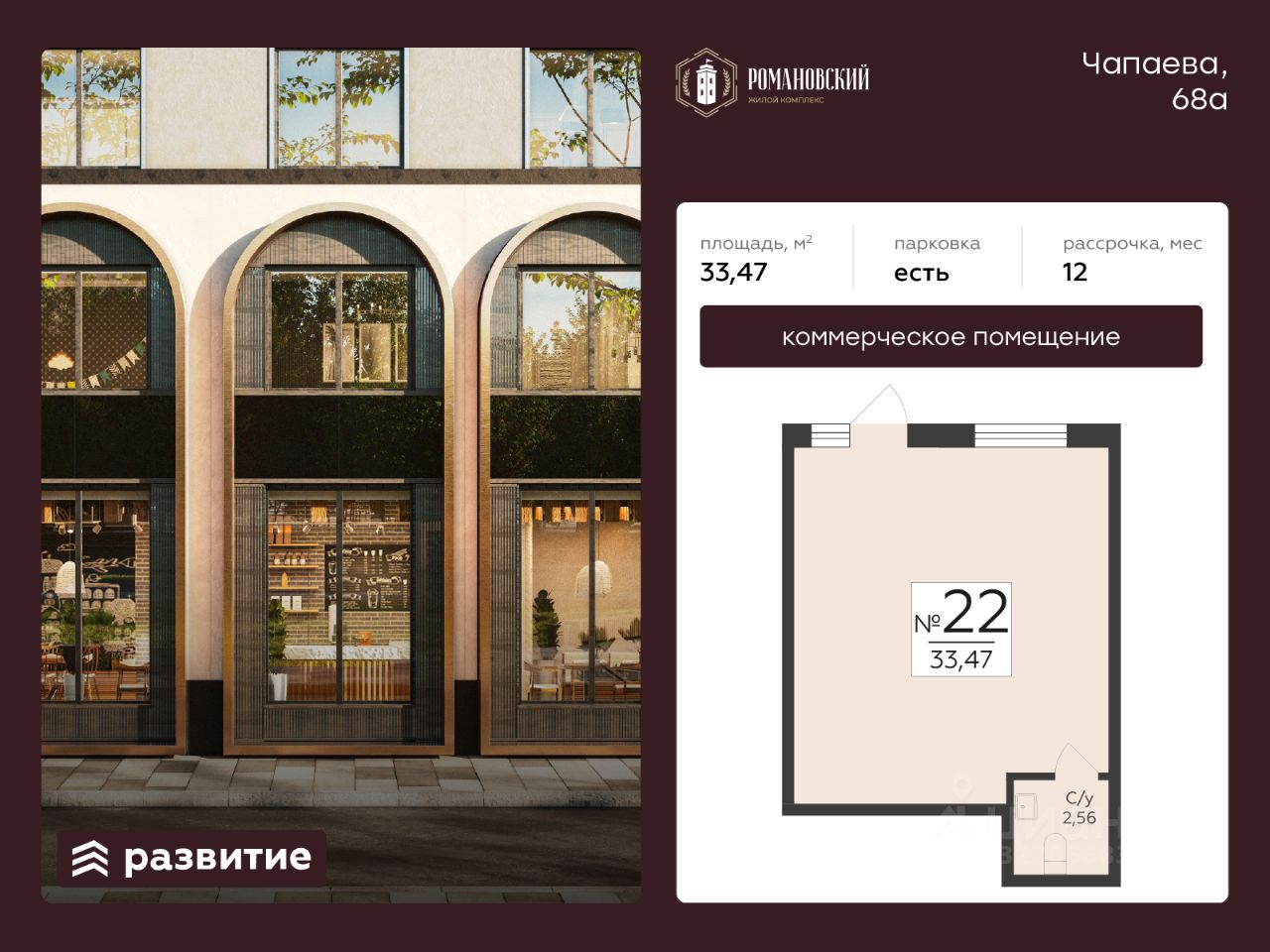 Предлагается к продаже помещение свободного назначения в Жилом Комплексе "Романовский" в самом сердце Ленинского района. Данный вариант отлично подходит для любого вида коммерческой деятельности, такого как: фитнес-студия, спортивная секция, салон красоты, пункт выдачи, магазин формата "у дома", продовольственный магазин, кофейня, и тд. В помещении есть отдельный вход и санузел. Выполнена черновая отделка, заведено электричество, подведена вода и канализация. Возможность размещения информационных вывесок на фасаде здания для привлечения внимания со стороны пешеходов. Преимущества месторасположения: • Романовский рассчитан на 700 жителей, имеется подземный и наземный паркинг на закрытой территории; • В 15 минутах ходьбы от дома расположены: стадион "Чайка", креативный кластер "Станция" и Военно-воздушная академия имени профессора Н. Е. Жуковского и Ю. А. Гагарина; • Удобные заезды на ключевые магистрали: улицы Чапаева и Краснознаменная, Казарменный переулок обеспечивают превосходную транспортную доступность; • В радиусе 750 метров расположены три остановки общественного транспорта. Более 11 маршрутов общественного транспорта позволят без суеты добраться в любую точку города; • В районе уже сформирована инфраструктура: продуктовые магазины, аптеки, кафе, поликлиники, детские центры и другие повседневные сервисы. Отличный вариант для Вашего бизнеса! Возможно, вы искали: Коммерческая недвижимость в Воронеже, Коммерческая недвижимость на правом берегу, Купить коммерческое помещение на правом берегу, Коммерческое помещение в Ленинском районе, Коммерческая недвижимость на правом берегу Воронеж, Коммерческое помещение в жилом комплексе, Коммерция Романовский, Купить коммерческую недвижимость в Воронеже, Купить коммерческую недвижимость Романовский, Нежилое помещение Романовский, Купить нежилое помещение в Романовском, Площади для инвестиций в Воронеже, Стоимость коммерции в Воронеже, Стоимость коммерции в ЖК Романовский, Коммерческая недвижимость в Воронеже на 1 этаже, Продажа нежилого помещения в Воронеже, Продажа торгового помещения в Воронеже, Офис в Воронеже, Нежилые помещения в Воронеже, Коммерция в Воронеже, Торговые площади в Воронеже, Стоимость нежилого помещения в Воронеже.