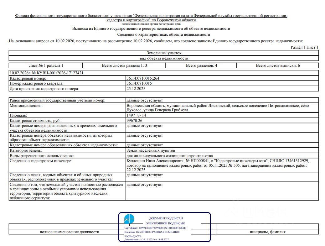 Воронежская область, муниципальный район Лискинский, сельское поселение Петропавловское, село Духовое, улица Генерала Грибкова, с кадастровым номером 36:14:0810015:264 с разрешенным использованием для индивидуального жилищного строительства, площадью 1 497 кв.м.