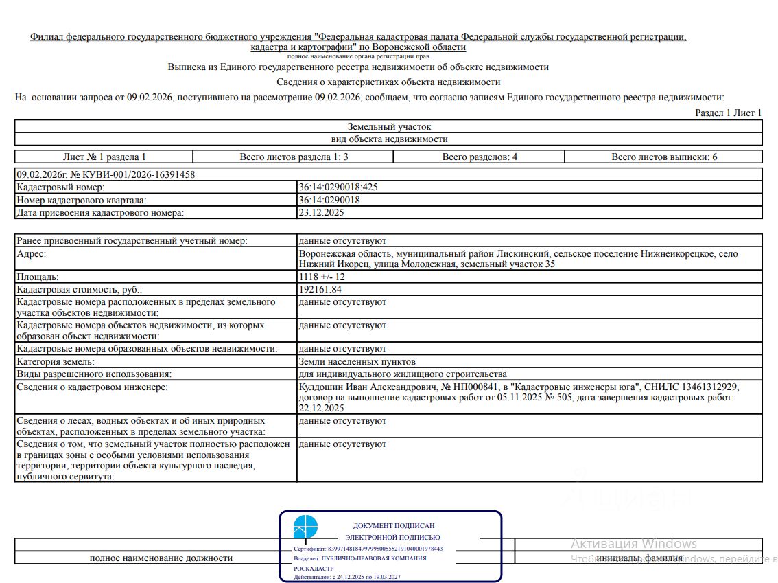Воронежская область, муниципальный район Лискинский, село Нижний Икорец, улица Молодежная, земельный участок 35, с кадастровым номером 36:14:0290018:425 с разрешенным использованием для индивидуального жилищного строительства, площадью 1 118 кв.м.