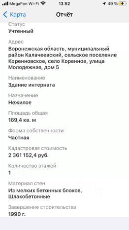Адрес: Воронежская область, муниципальный район Калачеевский, село Коренное, ул Молодежная 5 Кадастры: Здание 36:10:1400009:263 Земля 36:10:1400009:37