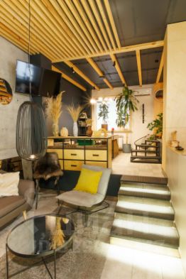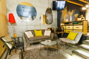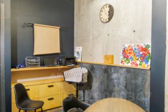 Отдельная зона для переговоров с партнёрами: комфортный диван, дизайнерские зеркала на бетонной стене.