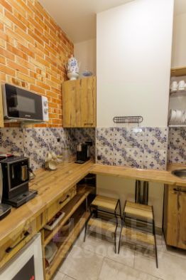 Кухонная зона: деревянные навесные и напольные шкафы для посуды и бытовой техники.
