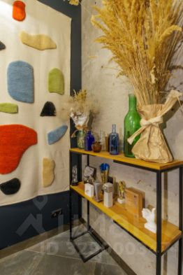 Санузел: ручная роспись на стенах, навесной шкаф для хранения.
