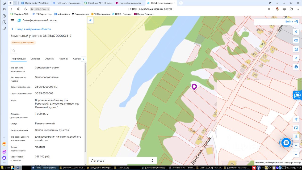 Лот 1. Земельный участок площадью 1000 кв. м, кадастровый номер 36:25:6700003:117, местонахождение: Воронежская обл., Рамонский р-н, д. Новоподклетное, пер. Охотничий тупик, 1. Собственник - Золототрубов С.С.