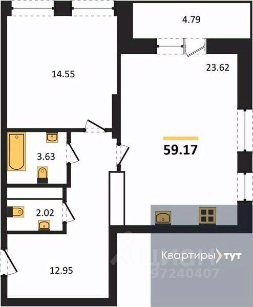 Квартира: 1 к 59,17 кв.м., 15 этаж в комплексе Галилей, 1 очередь, корп.3, сдача: 3кв. , этажей: 25, адрес Воронеж г., Кривошеина ул., д. 13/14, Застройщик: ГК Крайс.