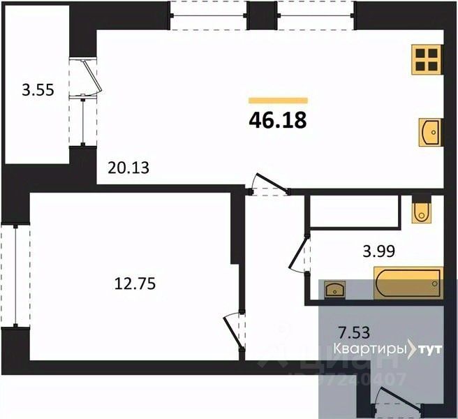 Квартира: 1 к 46,18 кв.м., 22 этаж в комплексе Галилей, 1 очередь, корп.3, сдача: 3кв. , этажей: 25, адрес Воронеж г., Кривошеина ул., д. 13/14, Застройщик: ГК Крайс.