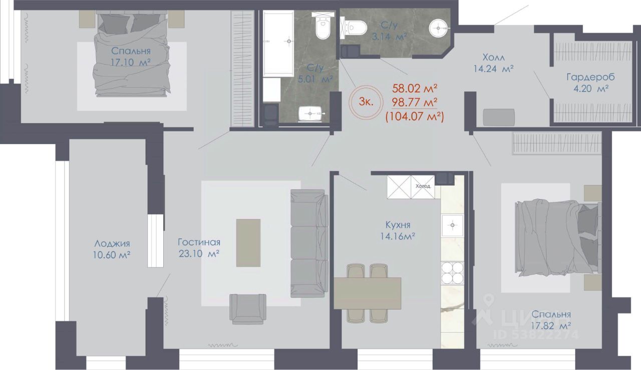 Продаётся 3-комнатная квартира в строящемся доме (Дом 1), срок сдачи: IV-кв. 2025, общей площадью 104.05 кв.м., на 4 этаже. Новый жилой комплекс "48" от группы компаний "Семья" расположен по адресу: г. Воронеж, по ул. пр-кт Труда.