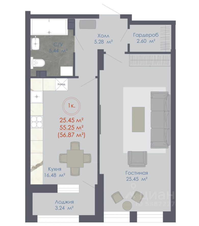 Продаётся 1-комнатная квартира в строящемся доме (Дом 1), срок сдачи: IV-кв. 2025, общей площадью 57.11 кв.м., на 20 этаже. Новый жилой комплекс "48" от группы компаний "Семья" расположен по адресу: г. Воронеж, по ул. пр-кт Труда.