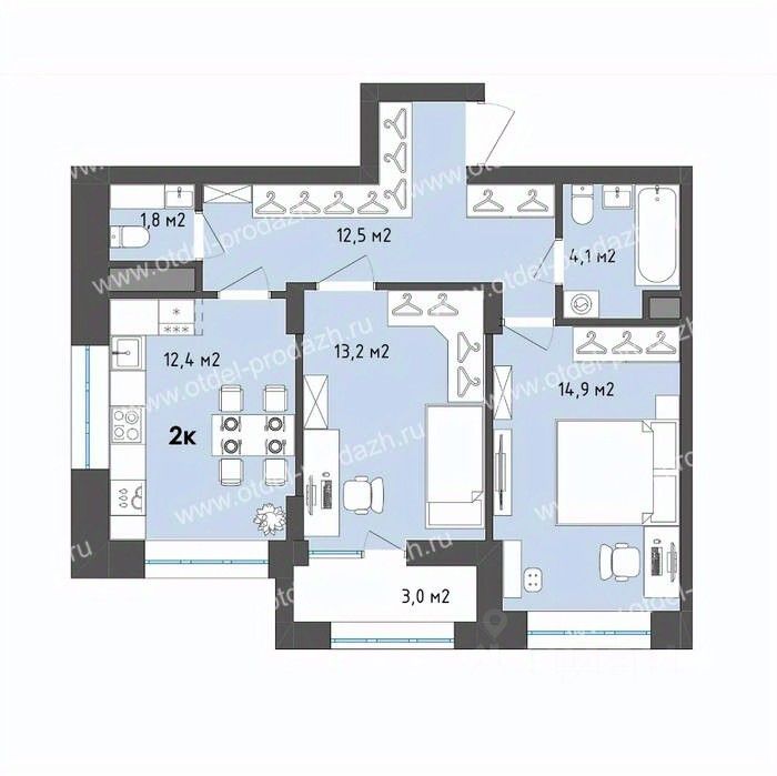 Квартиры сдаются в предчистовой отделке "white box" - гипсовая штукатурка, стяжка пола, разводка электрики.