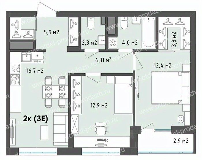 Квартиры сдаются в предчистовой отделке "white box" - гипсовая штукатурка, стяжка пола, разводка электрики.
