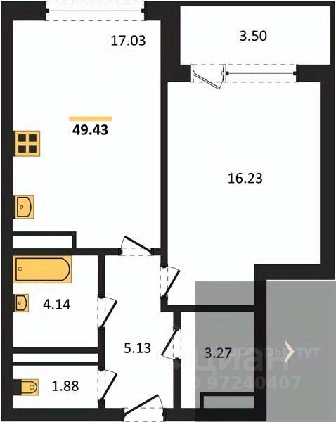 Квартира: 1 к 49,43 кв.м., 19 этаж в комплексе Бунин, 3 очередь, корп.1 (Секции 6,7), сдача: 2кв. , этажей: 23, адрес Воронеж г., Московский пр., д. 136, Застройщик: ВДК.