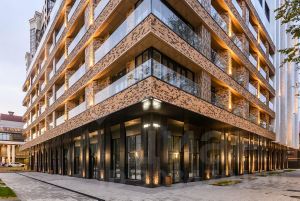 - Дом с оригинальной архитектурой и строгим характером композиционно состоит из четырех секций переменной этажности от 5 до 12 этажей.