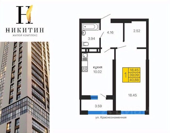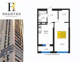 Продаётся 1-комнатная квартира в строящемся доме (Дом 1), срок сдачи: IV-кв. 2027, общей площадью 40.88 кв.м., на 6 этаже. Жилой комплекс "Никитин" расположен в Ленинском районе города Воронеж. Он представляет собой современный жилой комплекс, который включает в себя несколько многоэтажных домов, обустроенных территорию и парковочные места.