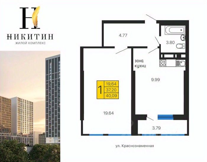 Продаётся 1-комнатная квартира в строящемся доме (Дом 1), срок сдачи: IV-кв. 2027, общей площадью 40.09 кв.м., на 6 этаже. Жилой комплекс "Никитин" расположен в Ленинском районе города Воронеж. Он представляет собой современный жилой комплекс, который включает в себя несколько многоэтажных домов, обустроенных территорию и парковочные места.