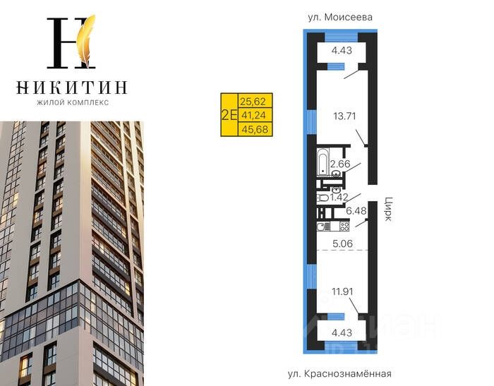 Продаётся 1-комнатная квартира в строящемся доме (Дом 1), срок сдачи: IV-кв. 2027, общей площадью 45.68 кв.м., на 6 этаже. Жилой комплекс "Никитин" расположен в Ленинском районе города Воронеж. Он представляет собой современный жилой комплекс, который включает в себя несколько многоэтажных домов, обустроенных территорию и парковочные места.