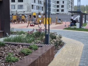 Закрытый двор с детскими площадками, сквер перед домом.